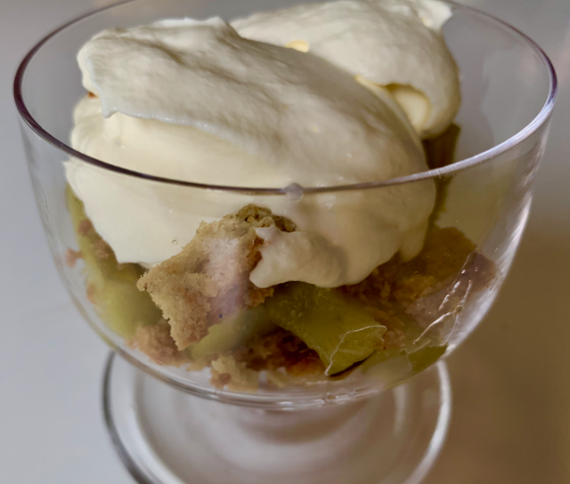 Dela smuldegen i bitar. Lägg hälften i botten av serveringsskålar. Lägg sedan på rabarbern och resten av smuldegen. Klicka på grädden som vispats med florsocker och vaniljsocker.
